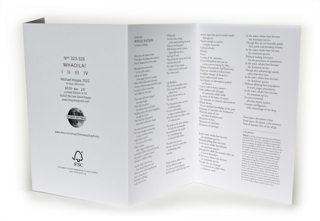 Limited edition large format giclee prints and quadriptych greeting card/artist’s book featuring the Heathcote Williams poem, Whale Nation, are for sale through Etsy.