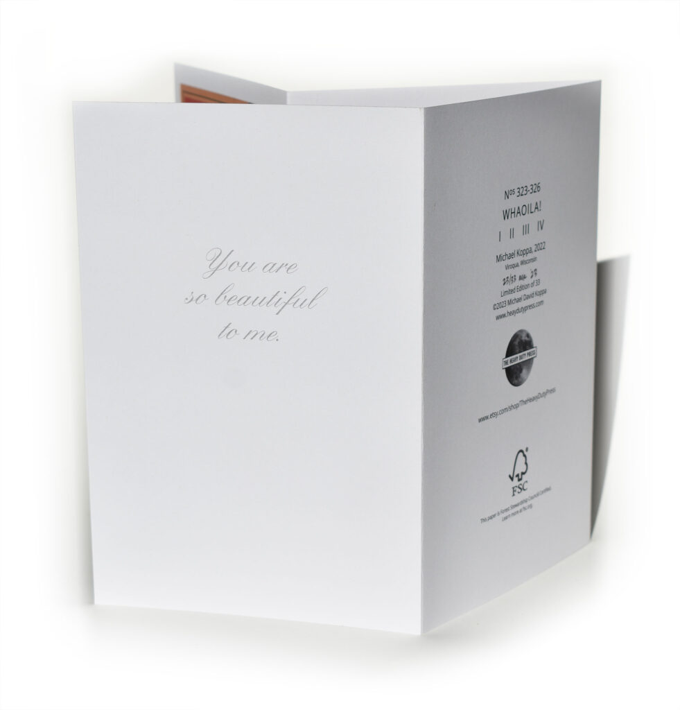 With Whaoila!, I challenged myself to break from the practice of creating suites of asymmetrically composed, surrealistic visual dramas, and instead create a suite of visually connected collages with abstract shapes and color, connected to each other with continuous lines of common elements. And then came the whales, which had been carefully cut for some unknown purpose six months earlier. When it came time to think about publishing greeting cards with these images, publishing four individual cards of such similarity felt like a bad investment in inventory. Because they were created together, as one piece, it became clear that they should be presented to whatever audience they reach as a quadriptych, which lead to the publication of the first polyptych collage greeting card published by The Heavy Duty Press. This new way of presenting my collages to their audience ties together, for the first time, the commercial art business of publishing greeting cards with the fine art practice of creating artist’s books, as the new publication is not only a card, but also an accordion-fold book, and is catalogued as such. $20 via Etsy